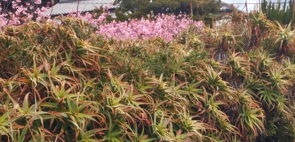 アロエの里の下田市道をあるいているとキダチアロエ越しに満開の河津桜、今年は雪でだいぶダメージを受けたアロエたち、冬までには元気を取り戻させようとがんばります。そろそろ株分けや植え替え考え始めても良いころです。